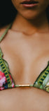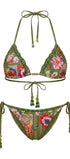 Set de bikini de dos piezas con silueta de triángulo clásica. elevado por un lujoso bordado manual de mostacillas y canutillos de cristal. Los canutillos verdes aportan un brillo facetado y una estructura lineal que perfila el top y el panty. El top incluye un pasador metálico dorado central y el panty cuenta con lazos laterales ajustables terminados en borlas artesanales tejidas. Detalles Técnicos de la Pedrería Composición del Bordado: La alternancia entre canutillos (alargados) y mostacillas (redondas) crea un juego de luces dinámico que cambia según el ángulo del sol. Resistencia: El bordado se realiza sobre un refuerzo interno oculto para evitar que el peso de los canutillos ceda la lycra, manteniendo el ajuste perfecto del triángulo