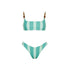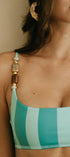 El equilibrio perfecto entre sporty-chic y lujo artesanal. Este set destaca por su top de silueta tipo scoop que ofrece soporte y comodidad, elevado por tirantes con detalles de piedras pulidas y esferas doradas. Su estampa de rayas en colores vibrantes crea un efecto visual dinámico y moderno.