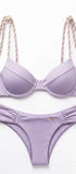 Su top está diseñado con una estructura que incluye copas y aros, garantizando un soporte superior y una silueta definida. El detalle protagonista son sus tirantes ajustables confeccionados en cordón náutico trenzado en tonos lila y crema, que terminan en lazos sobre los hombros para un ajuste personalizado y femenino.panty de lycra satinada en tono lila, caracterizado por sus laterales drapeados. Este diseño inteligente distribuye la presión de forma uniforme, evitando que la prenda se entierre en la piel y proporcionando una transición suave en la cadera.