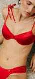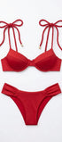 Set de bikini de lujo con top de copa preformada. El diseño destaca por sus tirantes de cordón náutico trenzado que se anudan sobre los hombros, permitiendo un ajuste personalizado y un detalle decorativo con terminales dorados. El panty de tiro medio cuenta con laterales anchos drapeados que no marcan la figura y un detalle de dije metálico posterior.Detalles Técnicos Visuales Soporte de Copa: Ideal para quienes buscan realce y seguridad, ya que la copa interna mantiene su forma y brinda una silueta redondeada. Ajuste Náutico: Los lazos en los hombros son funcionales; se pueden ajustar para elevar el busto según la comodidad de la clienta. Panty Confort: El diseño de los laterales del panty está pensado para suavizar la línea de la cadera gracias al efecto drapeado de la tela.