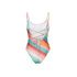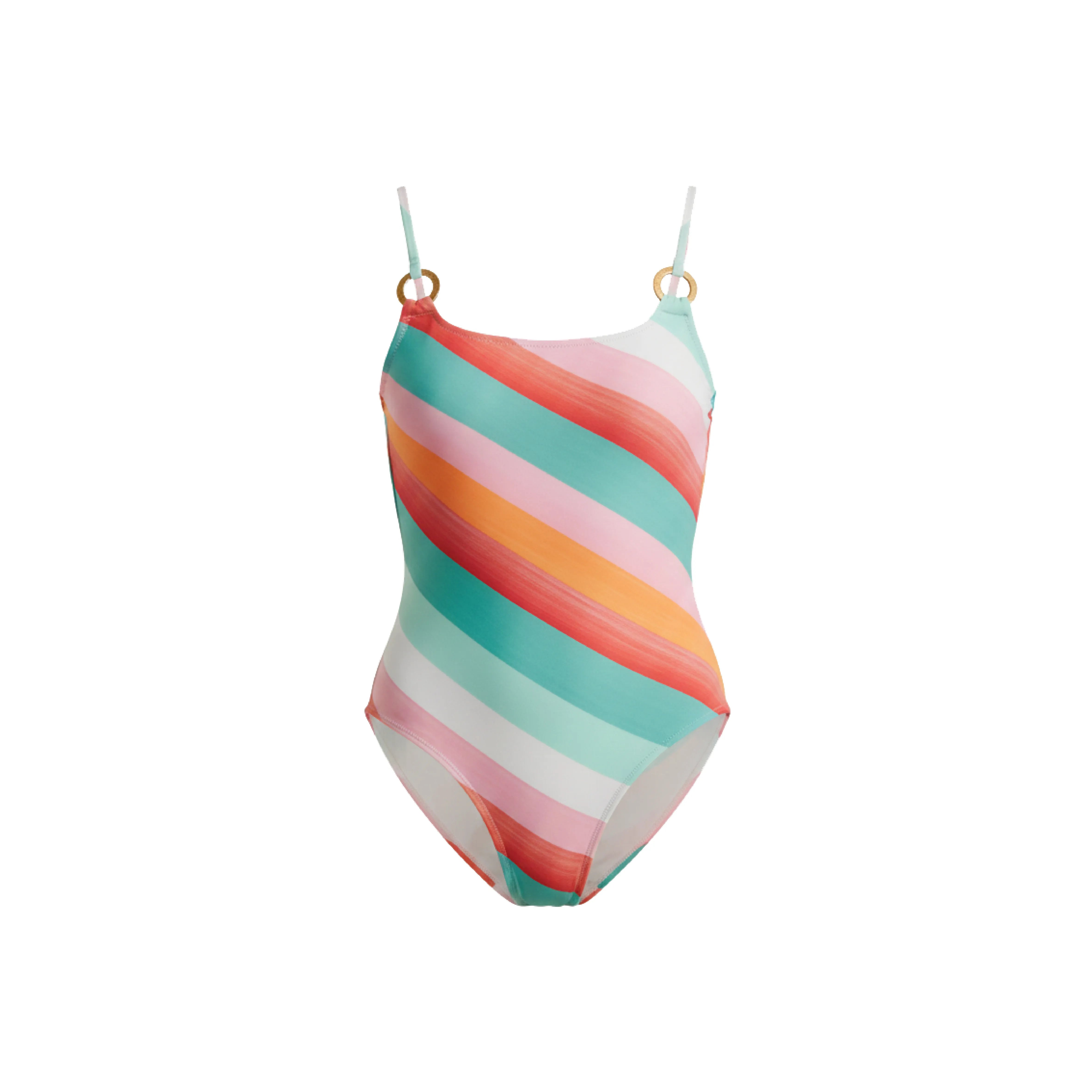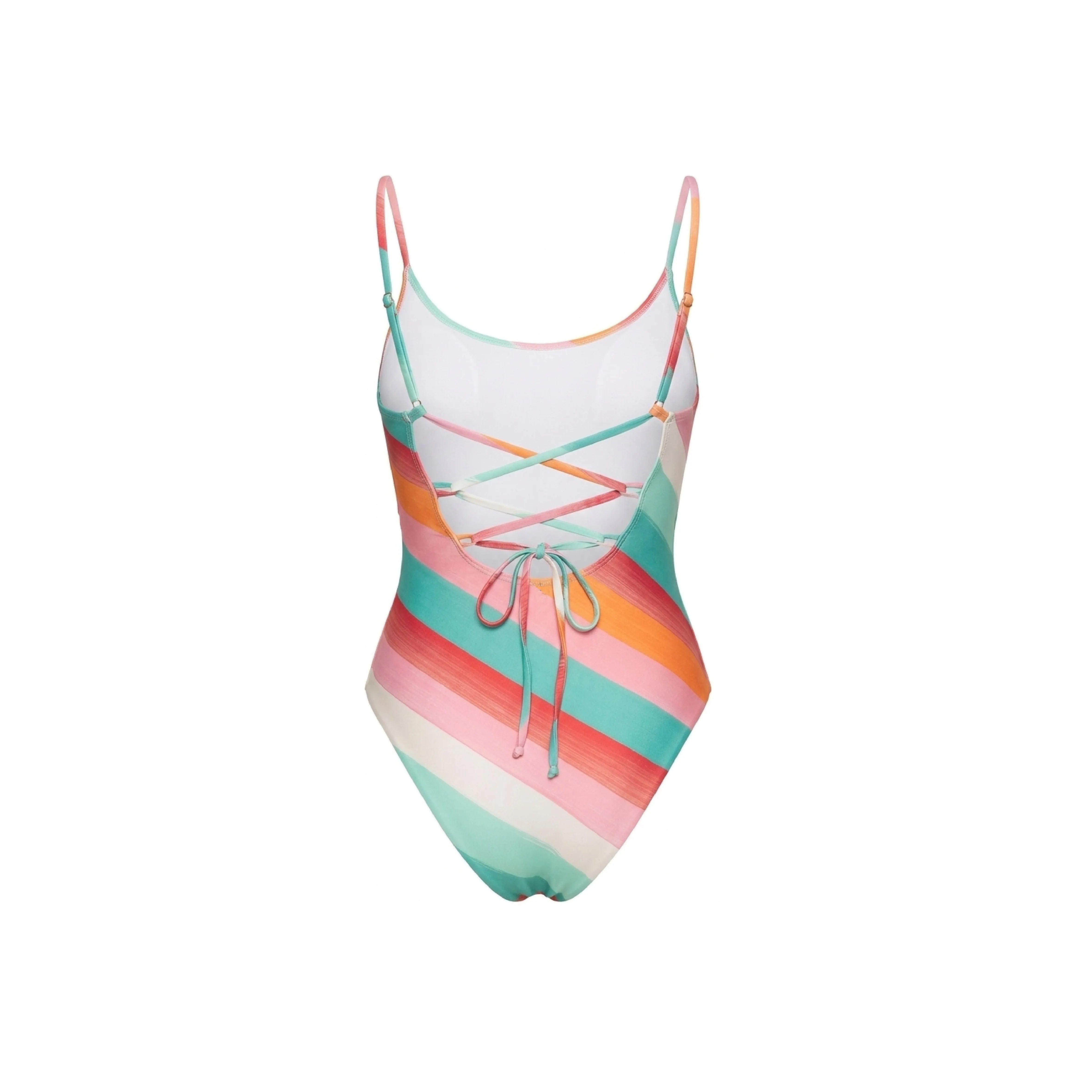 La esencia del minimalismo sofisticado. Este traje de baño de una pieza presenta un escote redondeado y cargaderas finas que se extienden hacia una espalda profundamente descubierta con amarre ajustable. Su diseño de rayas diagonales en tonos vibrantes está pensado para estilizar la figura con una elegancia sin esfuerzo. Detalles técnicos de este modelo: Silueta Frontal: El corte tipo tank ofrece una cobertura cómoda y segura, ideal para un look de playa activo pero elegante. Espalda "Open Back": El detalle del lazo ajustable en la espalda permite personalizar el entalle, asegurando que la pieza se mantenga en su lugar mientras resalta la curva natural de la espalda. Acabado Limpio: Las costuras invisibles en los bordes refuerzan esa estética de lujo y evitan marcas en la piel.